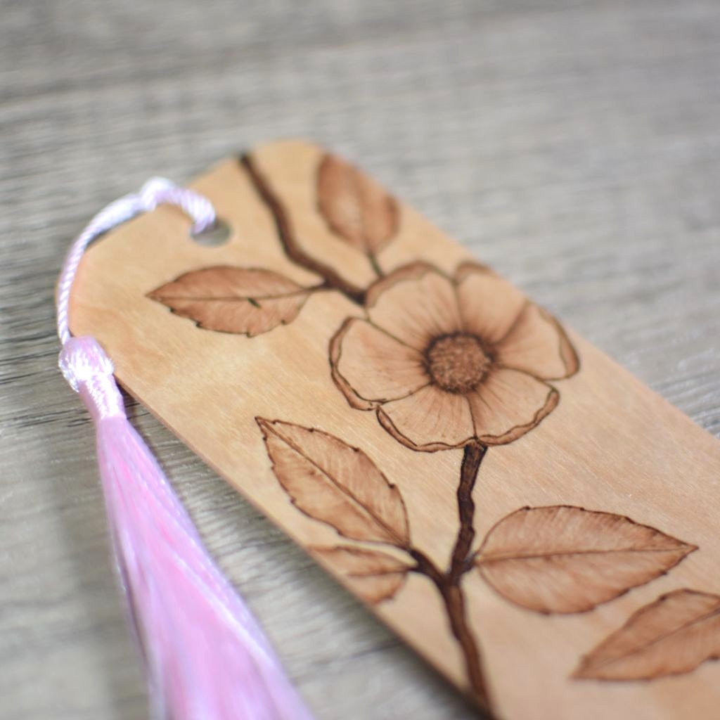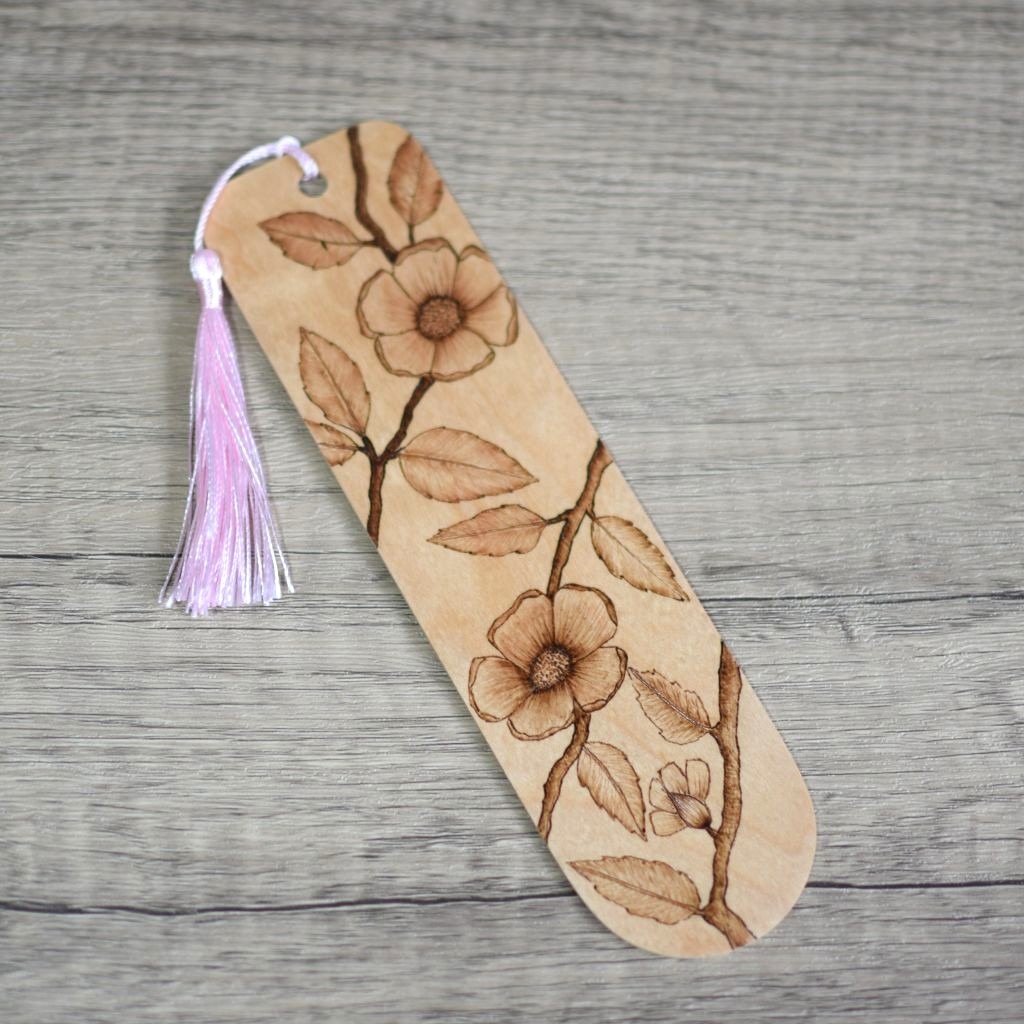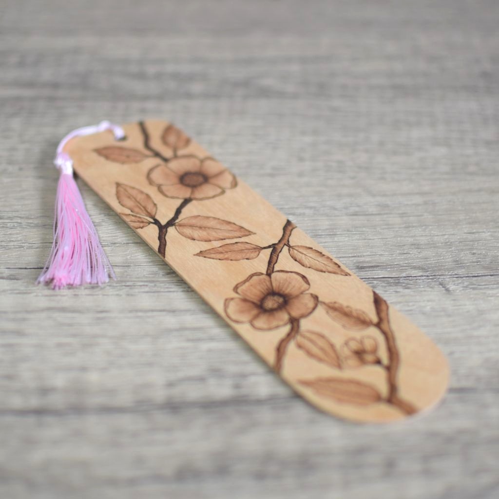The wooden bookmark features a wild flower design and finished with a colourful deep red tassel. Designed and hand burnt in my Staffordshire home studio this wooden bookmark would make a great gift for a book lover or a perfect treat for yourself.
