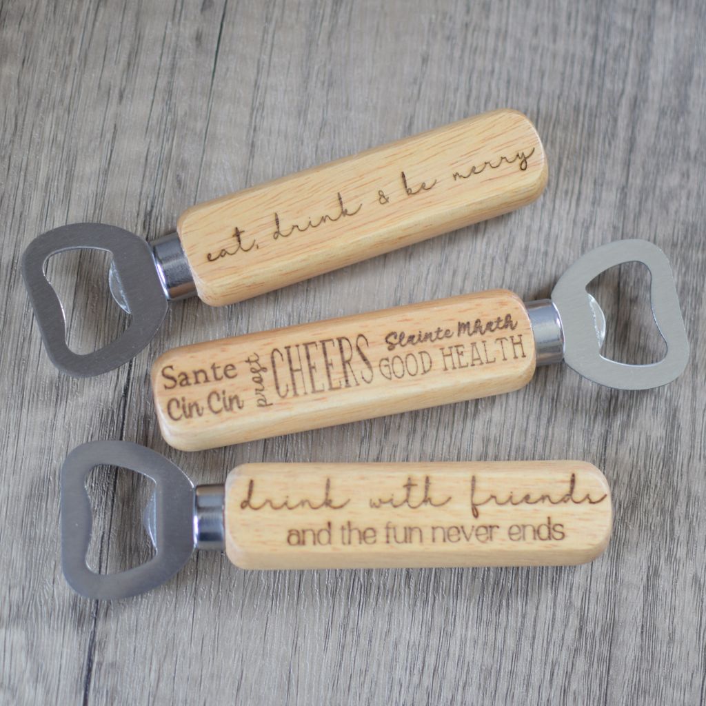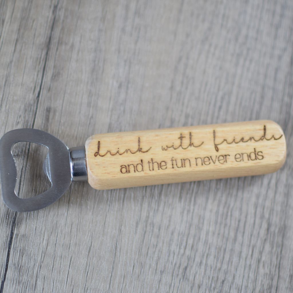 A range of fun laser engraved wooden handled bottle openers with a drinking with friends theme. Because when you enjoy time with your family and friends, the fun never ends!
