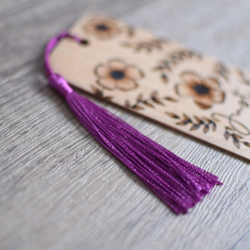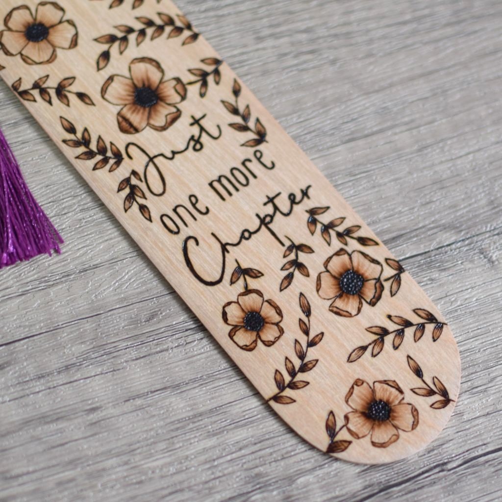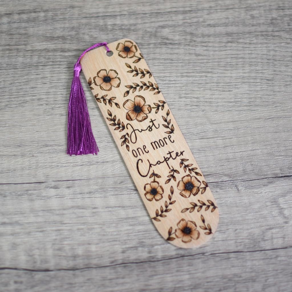 The wooden bookmark features a blossom design and “one more chapter” finished with a purple tassel. Designed and hand burnt in my Staffordshire home studio this wooden bookmark would make a great gift for a book lover or a perfect treat for yourself.