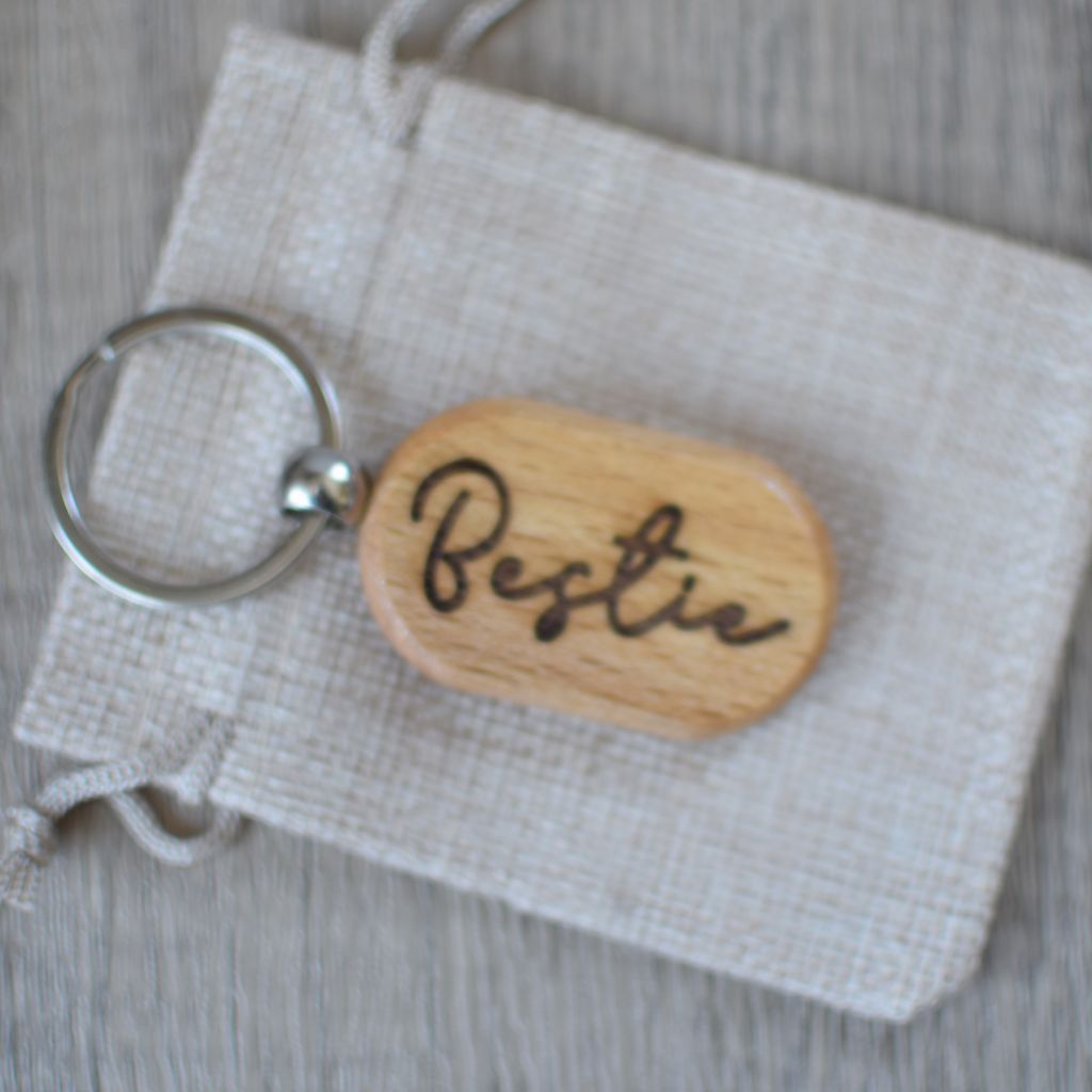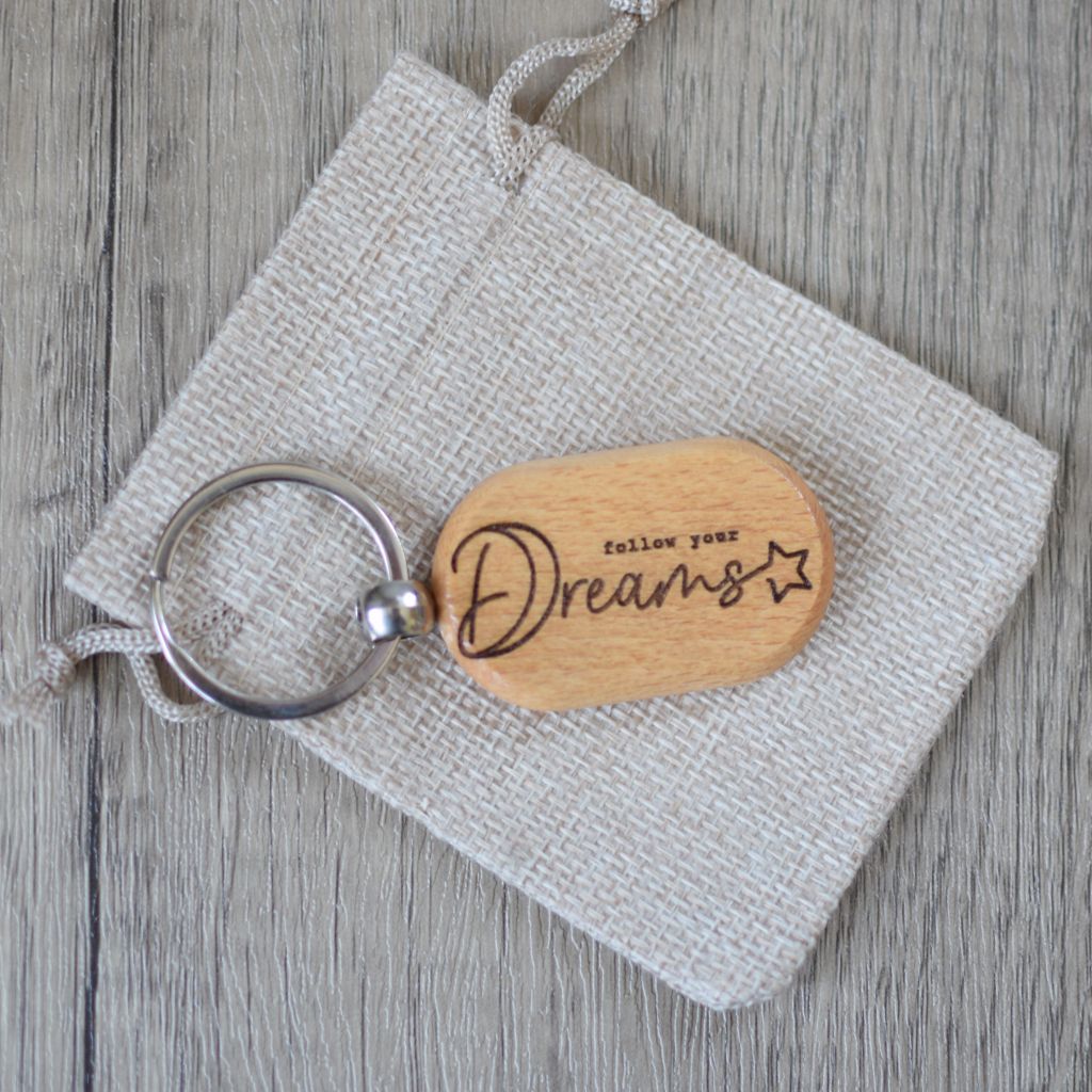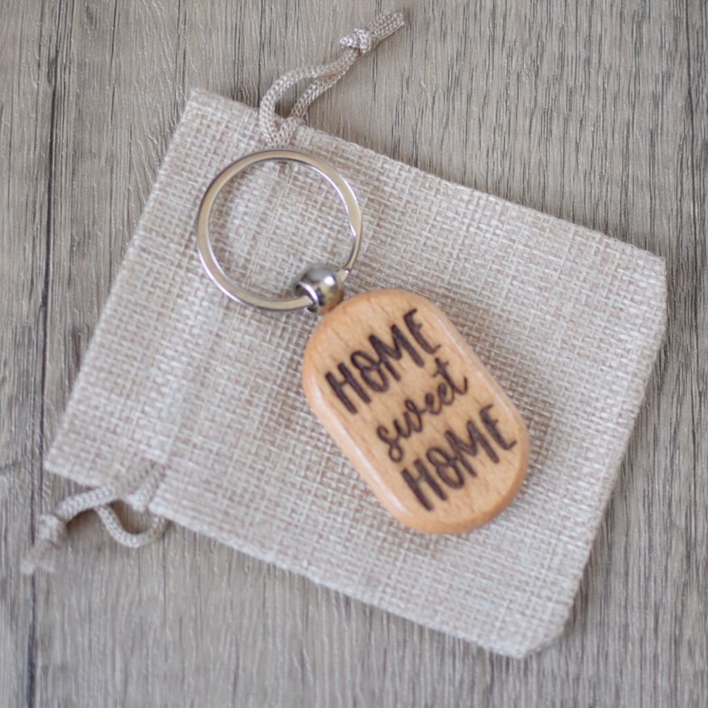Each keyring is laser engraved on both sides and its fitted with a bead style chromed metal ring and will come enclosed in a fabric gift bag.