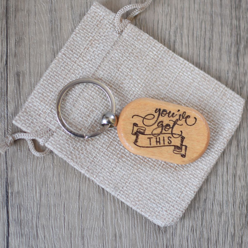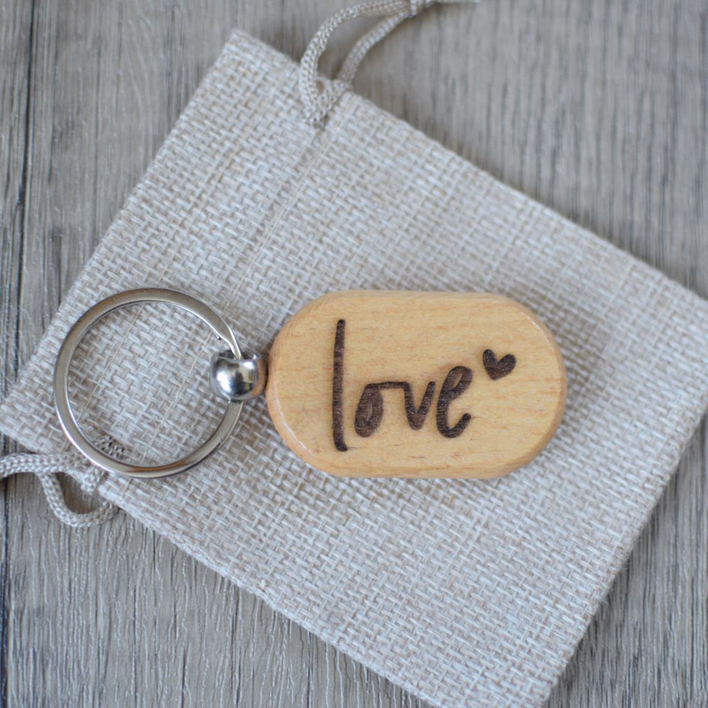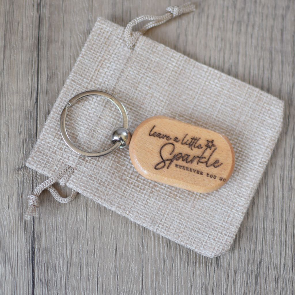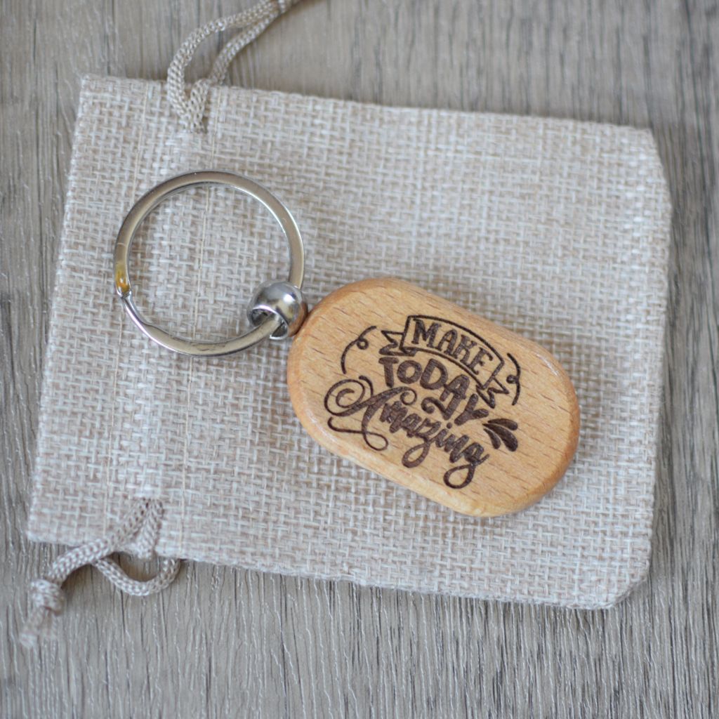 Each keyring is laser engraved on both sides and its fitted with a bead style chromed metal ring and will come enclosed in a fabric gift bag.