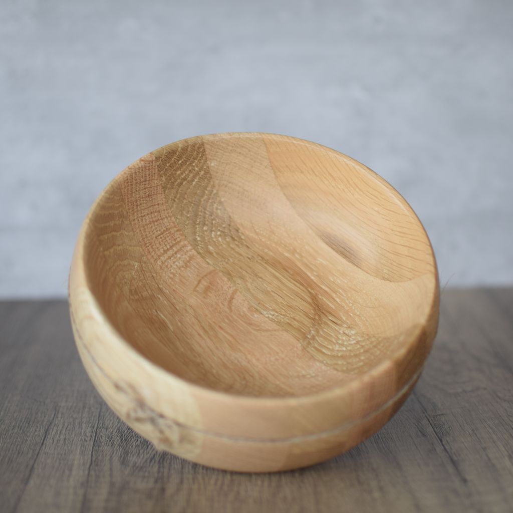 Eco-conscious – This piece has been made utilising space sections of laminated Oak to create a blank ready for turning. We try to use all our lefts overs and spare bits where ever possible to make sure that nothing goes to waste.
